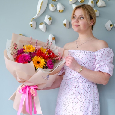 Букет из 19 радужных гербер - это способ подарить чувство счастья, яркое настроение и вдохновение.