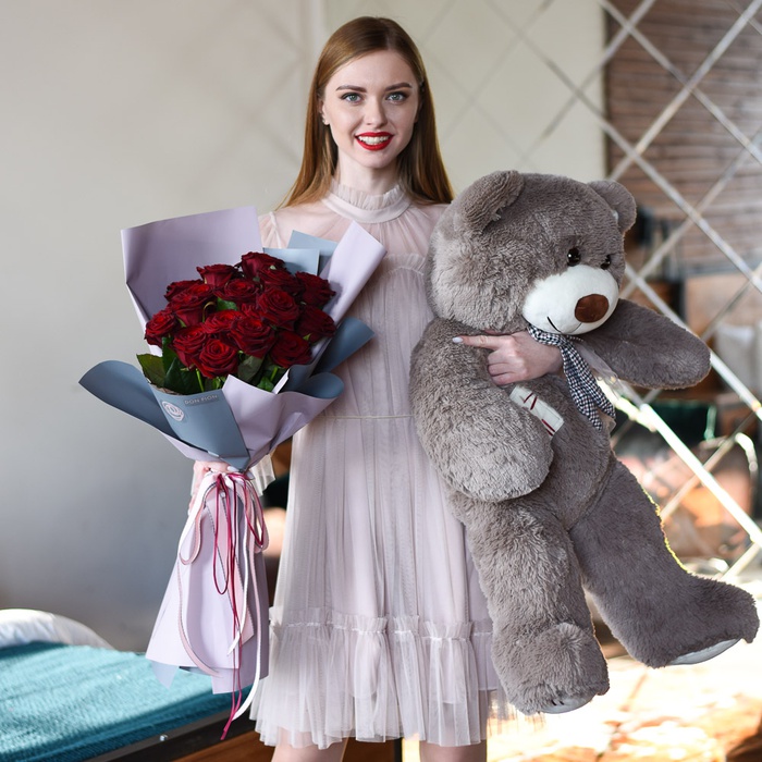 Яркий букет в сочетании с большим медведем, будет прекрасным подарком к любому празднику!