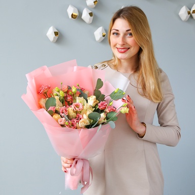 Когда хочется подарить охапку нежности. Букет из элегантной розы Шарман, игривой эустомы и ароматного эвкалипта. Подойдет как подарок для любимой женщины, мамы, так и коллеге на День рождения.