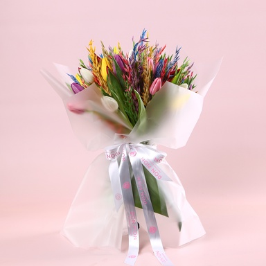Букет с тюльпанами «Весеннее танго» — это яркая, живая композиция, наполненная энергией весны и позитивными эмоциями. В букете собраны 51 тюльпан микс, дополненные окрашенным диким овсом, который придаёт композиции оригинальную фактуру и современный характер. Разнообразие оттенков создаёт ощущение движения и радостного танца, где каждый цвет подчёркивает красоту другого. Декоративный овёс добавляет букету лёгкости и стиля, делая его эффектным и запоминающимся. «Весеннее танго» станет отличным подарком для любимого человека, близкого друга или как выразительный знак внимания.