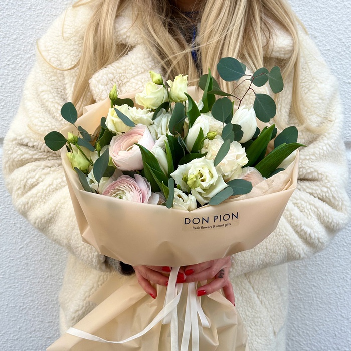 Ранункулюс, тюльпан, роза, эвкалипт, эустома, упаковка