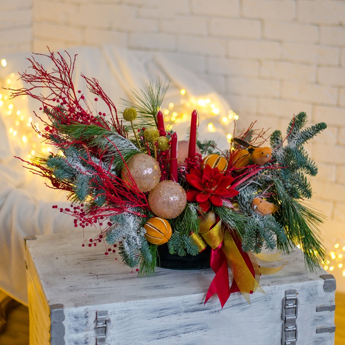 Дизайнерская композиция из хвои и новогоднего декора - прекрасно дополнит интерьер и станет раскошным украшением рождественского и новогоднего стола.