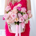 Коробка, роза кустовая "Мисти Бабблс", роза "Пинк Охара", роза "Шиммер", гортензия