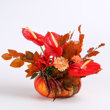 Тыква, антуриум - 4 шт, гвоздика - 4 шт, фагус стабилизированный - 1 шт, капсикум, перец чили сухой - 5 шт