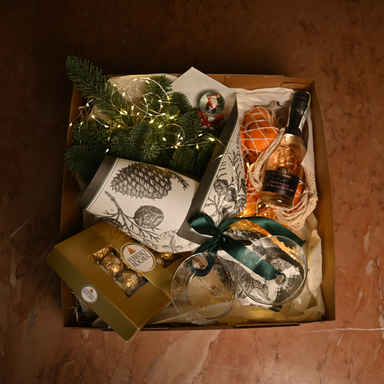 «Магия Нового года» — это готовое праздничное настроение в стильной коробке. Два бокала для игристого, изысканные конфеты Ferrero Rocher и сертификат на Prosecco Rosé создают идеальный дуэт для волшебного зимнего вечера. Новогодний шар «Святой Николай» и теплая гирлянда наполняют пространство уютным сиянием. Живая хвоя и праздничный декор добавляют аромат леса и ощущение настоящего чуда.