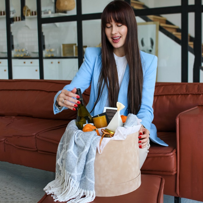 Коробка, плед, мед, сладости от Spell, сертификат на вино, свеча, тыква