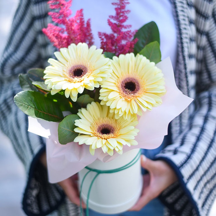 Шляпная коробка с летними герберами и осенней зеленью - интересная альтернатива привычному букету!