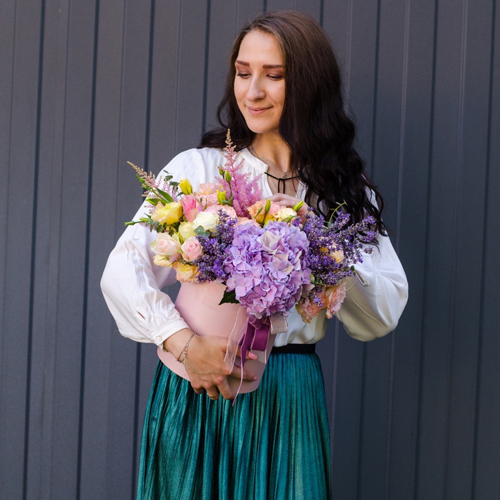 Коробка, эустома, гортензия, астильба, роза, лаванда.