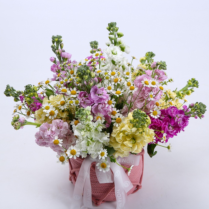 Корзина, маттиола микс - 15 шт, ромашка - 5 шт