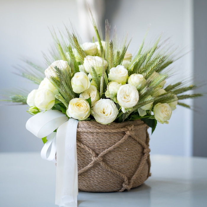 Добро пожаловать в магазин DonPion! Мы рады представить вам наш непревзойденный продукт - цветы в корзине "Сноу волд с пшеницей". Эта композиция воплощает в себе нежность и элегантность, сочетая белые розы и теплые нотки пшеницы.