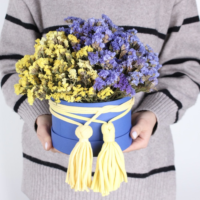 Эта изящная аранжировка статицы в желто-фиолетовых оттенках принесет в ваш дом чувство тепла и загадочности.