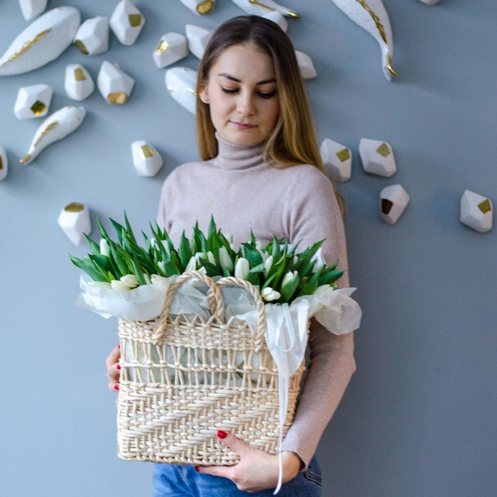 - Цветы в плетенной сумке "51 белый тюльпан"