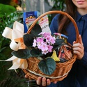 Поздравительная корзина с горшечным растением Сенполия, твердый сыр, итальянские грисини соленые 2 упаковки, баночка оливок