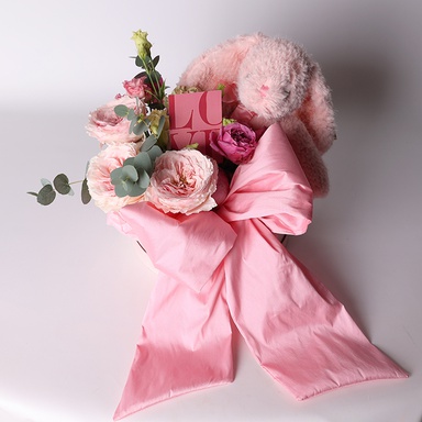 В составе набора – забавная игрушка зайчик и прекрасная цветочная композиция, создающая атмосферу уюта и тепла. Такой подарок станет отличным дополнением к любому торжеству или празднику.