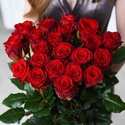 Монобукет з високих оксамитових троянд яскраво-червоного відтінку. Верхні пелюстки підкручені і трохи менші за розміром, а яскраво-зелені пелюстки ніжно обрамляють бутон. Універсальний букет - елегантний і класичний. Підійде як для випадкової незнайомки в якості компліменту, так і дружині, подрузі або колезі. Червона троянда завжди вважалася символом любові і поваги!