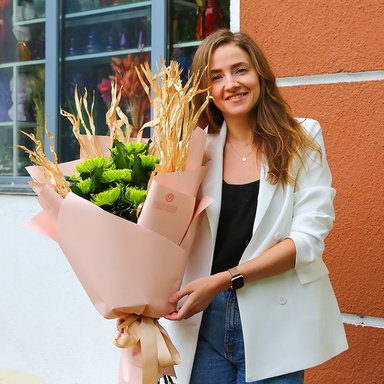 7 хризантем сорту Анастасія, пальма сухоцвіт в упаковці