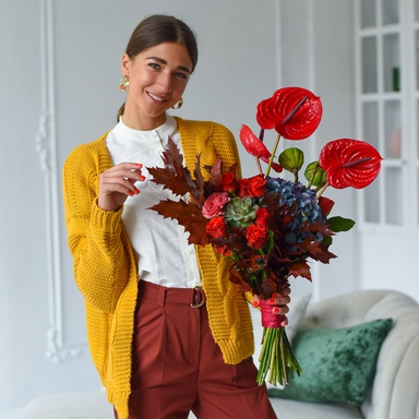 Творчий букет від флористів Don Pion. Екзотичний, оригінальний з осіннім настроєм. Букет підійде і жінці, і чоловікові.