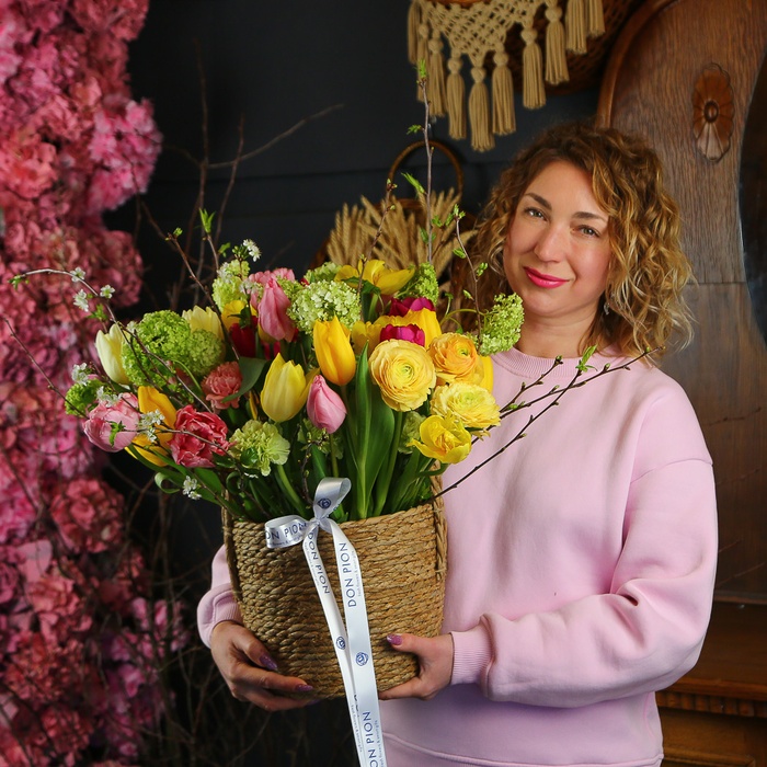 Кошик з квітами «Жіночий захват» — це витончена композиція, яка створена, щоб викликати щирі емоції та захоплення з першого погляду. У ній гармонійно поєднуються тюльпани різних відтінків, фактурний вібурнум та розкішний ранункулюс, що разом формують об’ємний, стильний і по-справжньому весняний ансамбль. Такий кошик виглядає елегантно та сучасно, даруючи відчуття легкості, тепла і турботи.