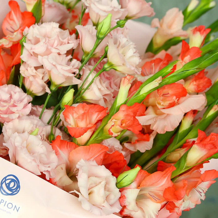Соковитий літній букет з сезонних гладіолусів. Смачні відтінки викликають посмішку на обличчі.