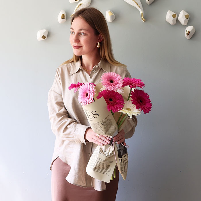 Букет з 9 гербер стане чудовим акцентом у вашому інтер'єрі або чудовим подарунком для близьких. Кожна квітка випромінює тепло та ніжність, даруючи радість та посмішки.