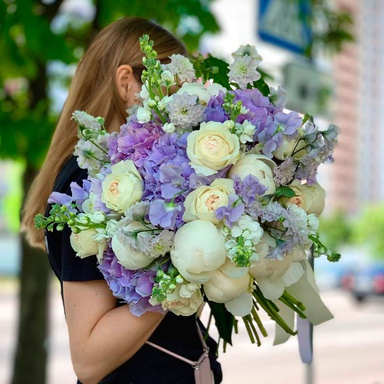 Цей букет захоплює своєю розкішшю та витонченістю. Латірус, гортензія, півонії та троянди поєднуються у м'якому лавандовому відтінку, створюючи чудову гармонію та надаючи вражаючий вигляд. Цей букет є ідеальним вибором для тих, хто шукає розкіш та елегантність у квітах.