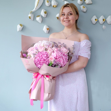 - Букет з гортензії, троянди та тюльпанів "Рожевий сад"