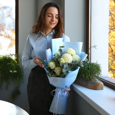 Троянда Аваланч, оксіпіталум, хризантема, евкаліпт, упаковка.