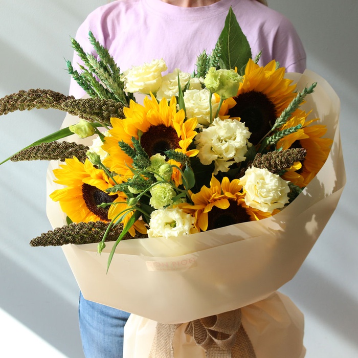 Еустома – 5 шт, соняшник – 5 шт, пшениця, сетарія, упаковка