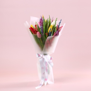 Букет з тюльпанів «Весняна посмішка» — це ніжна та водночас життєрадісна композиція, яка наповнює простір теплом і світлом. 15 тюльпанів мікс у поєднанні з фарбованим диким вівсом створюють легкий, повітряний образ, що асоціюється з початком весни, гарним настроєм і щирими емоціями. Різноманіття відтінків тюльпанів дарує відчуття свіжості, а фарбований овес додає букету оригінальної текстури та сучасного стилю. Така композиція ідеально підходить для подарунка коханій людині, подрузі, мамі або колезі, а також стане приємним знаком уваги без особливого приводу.