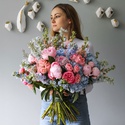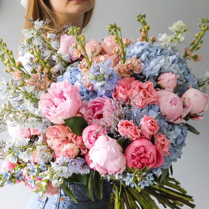 Цей букет з півоніями, гортензією, дельфініумом, матіолою та трояндою створює відчуття чарівного літнього саду, де кожна квітка розкриває свою унікальну магію та красу.