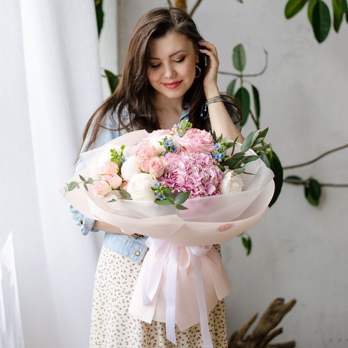 - Букет з гортензією та півоніями "Квіткова таємниця"