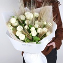 Цей букет вражає своєю елегантністю та ніжністю. Букет складається з 5 троянд сорту Сноу волд, які відомі своєю ніжністю та чарівністю. Кожна троянда - це витвір природи, що переносить вас у світ краси та гармонії. До цієї чудової троянди додана пшениця, яка символізує достаток і благополуччя.