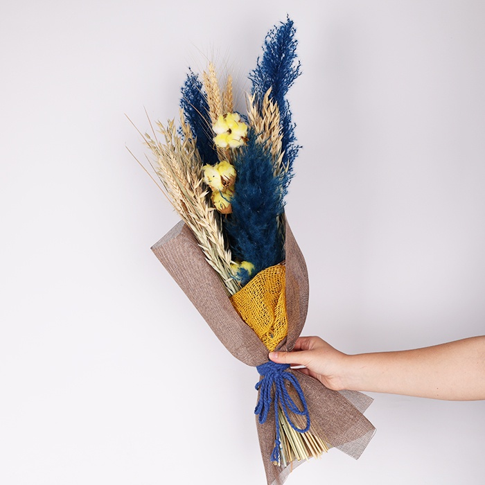 Букет із сухоцвітів "Барви вільного неба" від DonPion — це витончений символ краси та надії, що передає енергію чистого неба і теплих сонячних променів. Поєднання жовтих і синіх сухоцвітів створює гармонійний баланс кольорів, що символізують свободу і силу природи.