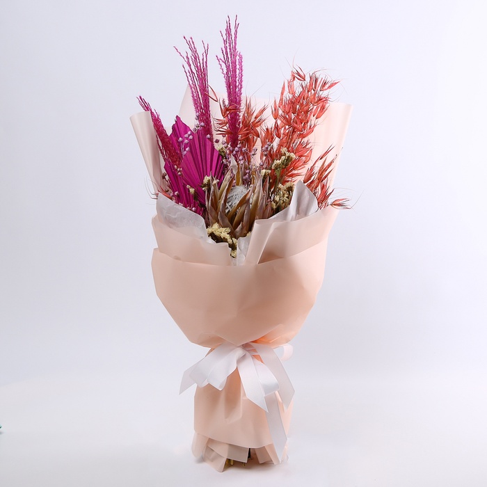 Букет із сухоцвітів «Королева пустелі» — це смілива, вишукана композиція з яскравим характером, створена для поціновувачів унікальної флористики. Центральним акцентом букета є екзотична протея — символ сили, витривалості та природної розкоші. Вона гармонійно поєднується з ретельно підібраними сухоцвітами, створюючи стильний образ із нотками дикої природи та сучасної елегантності. Такий букет стане ефектним акцентом в інтер’єрі, прикрасить простір або підкреслить індивідуальність свого власника.