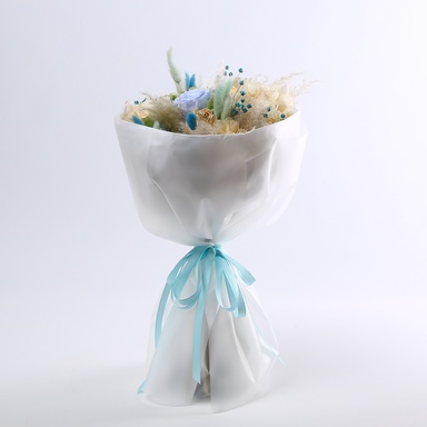 Букет із сухоцвітів «Небо над полем» — це витончена композиція, яка немов зупиняє мить, наповнюючи ваш простір гармонією та природною красою. Унікальне поєднання стабілізованої гортензії, ніжної троянди, блакитного лагурусу та льону створює м’яку, повітряну палітру в бежево-блакитних відтінках, що ідеально пасує до сучасного інтер’єру або святкового декору. Такий букет — не просто декор, а справжній акцент, що додає настрою, легкості та затишку кожному куточку вашого дому.