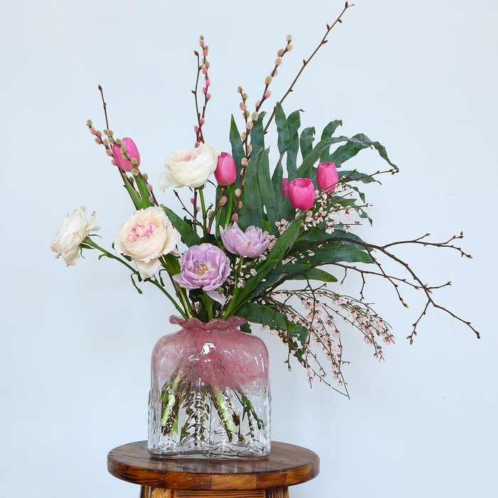 Ваза 20*10,5*23 см, троянда Девід Остін - 3 шт, тюльпан дабл - 2 шт, тюльпан - 5 шт, флебодіум - 2 шт, котики - 5 шт, липа - 2 шт
