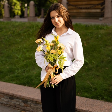 Букет з фрезії та гвоздики "Сяйво гармонії" — це справжня поезія в кольорах, де кожна квітка промовляє мовою ніжності та тепла. Жовта фрезія дарує відчуття сонячного світла та радості, зелений амарантус додає свіжості й природної гармонії, а персикова гвоздика ніжно підкреслює красу композиції, створюючи особливий настрій. Такий букет стане чудовим подарунком для найрідніших, знаком поваги вчителю або ж теплим компліментом людині, якій ви хочете подарувати усмішку.