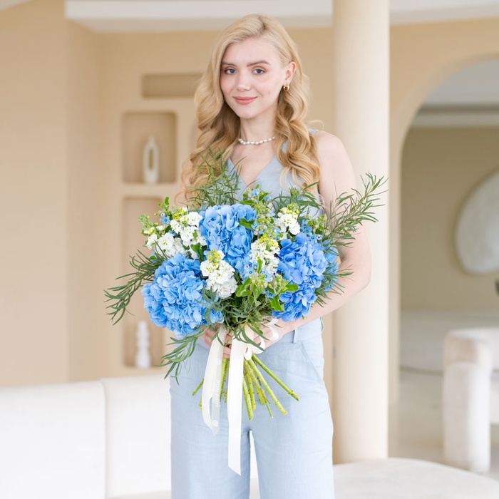 Наша новий букет з гортензією, оксипеталумом та матіолою "Мальовничий бриз" вражає своєю красою та неперевершеним шармом.