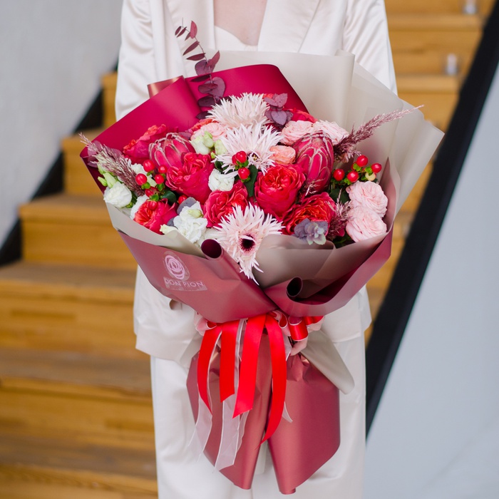 Протея, троянда, еустома, гербера, хіперікум, евкаліпт.