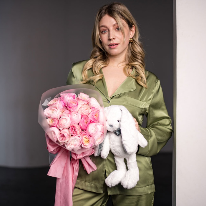 Ранункулюс - 10 шт, троянда "Девід Остін" - 13 шт, м'яка іграшка зайчик, бант - 2 шт
