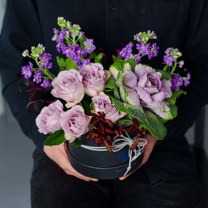 Коробка, брасика, троянда, матіола, анігозантус, калла.