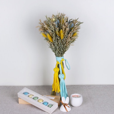 Букет з лагурусу та овесу додасть нотки природної краси, свічка зайчик принесе світло і тепло, а солодкий набір перепелиних яєць стане приємним доповненням до святкового столу.