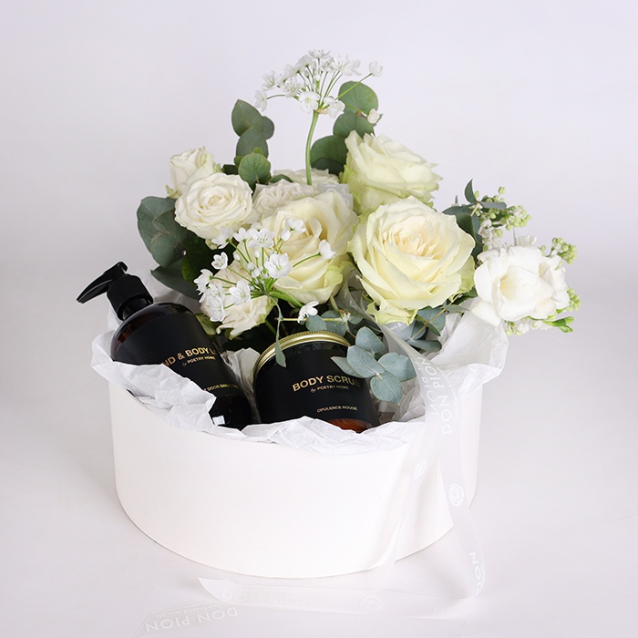 Вишукана квіткова композиція додає нотки весняної свіжості та елегантності, створюючи атмосферу справжнього блаженства. Цей набір стане ідеальним подарунком для тих, хто цінує естетику, природну красу та моменти справжнього задоволення.