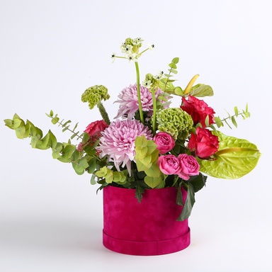 Коробка оксамитова, хризантема - 2 шт, целозія - 2 шт, троянда Кантрі Блюз - 3 шт, орнітогалум - 2 шт, антуріум - 2 шт, евкаліпт - 1 шт, седум - 5 шт, троянда Місті Бабблс - 1 шт.