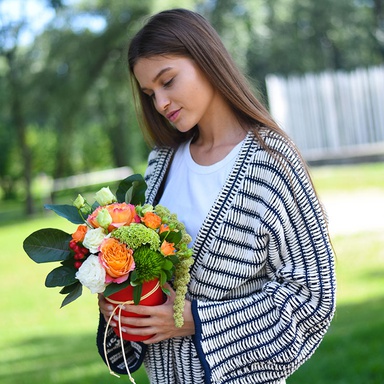 Роза Free Spirit, еустома, гвоздика, хіперікум, амарантус, целозия, коробка
