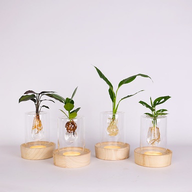Композиція з підсвіткою — це сучасний акцент для інтер’єру, де поєднано мінімалізм, природність і технологічну естетику. Рослини розміщені у прозорих колбах, завдяки чому коріння видно повністю — це створює ефект “левітації” та додає композиції легкості. Дерев’яна основа теплих тонів гармонійно контрастує зі склом, підкреслюючи природну красу зелені.