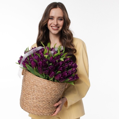 Квіти у кошику «101 фіолетовий тюльпан» — це розкішна композиція, що вражає з першого погляду. Насичений фіолетовий відтінок тюльпанів символізує глибокі почуття, повагу та захоплення, а велика кількість квітів створює ефект справжнього квіткового океану. Акуратно оформлені у стильному кошику, тюльпани виглядають урочисто й водночас витончено. Такий подарунок стане ідеальним вибором для особливої події — ювілею, дня народження, освідчення або важливої дати, коли хочеться справити незабутнє враження.