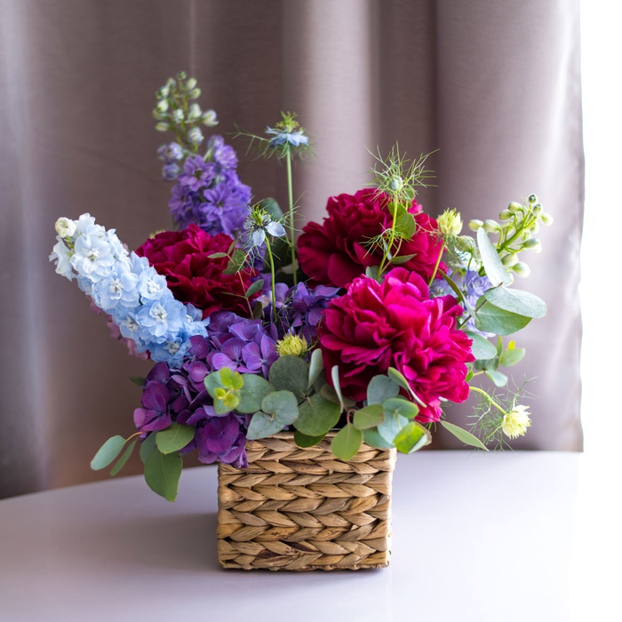Кошик, півонія - 3 шт, гортензія - 2 шт, дельфініум - 5 шт, нігелла - 3 шт, евкаліпт цінерея - 1 ч