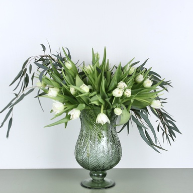 - Квіти у вазі "31 тюльпан з евкаліптом"