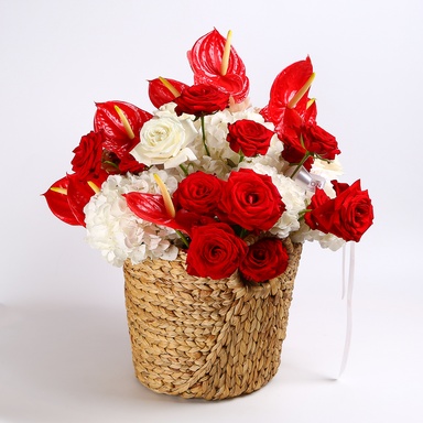 Кошик, гортензія - 10 шт, антуріум - 13 шт, троянда Плая бланка - 10 шт, троянда Мері Мі - 10 шт